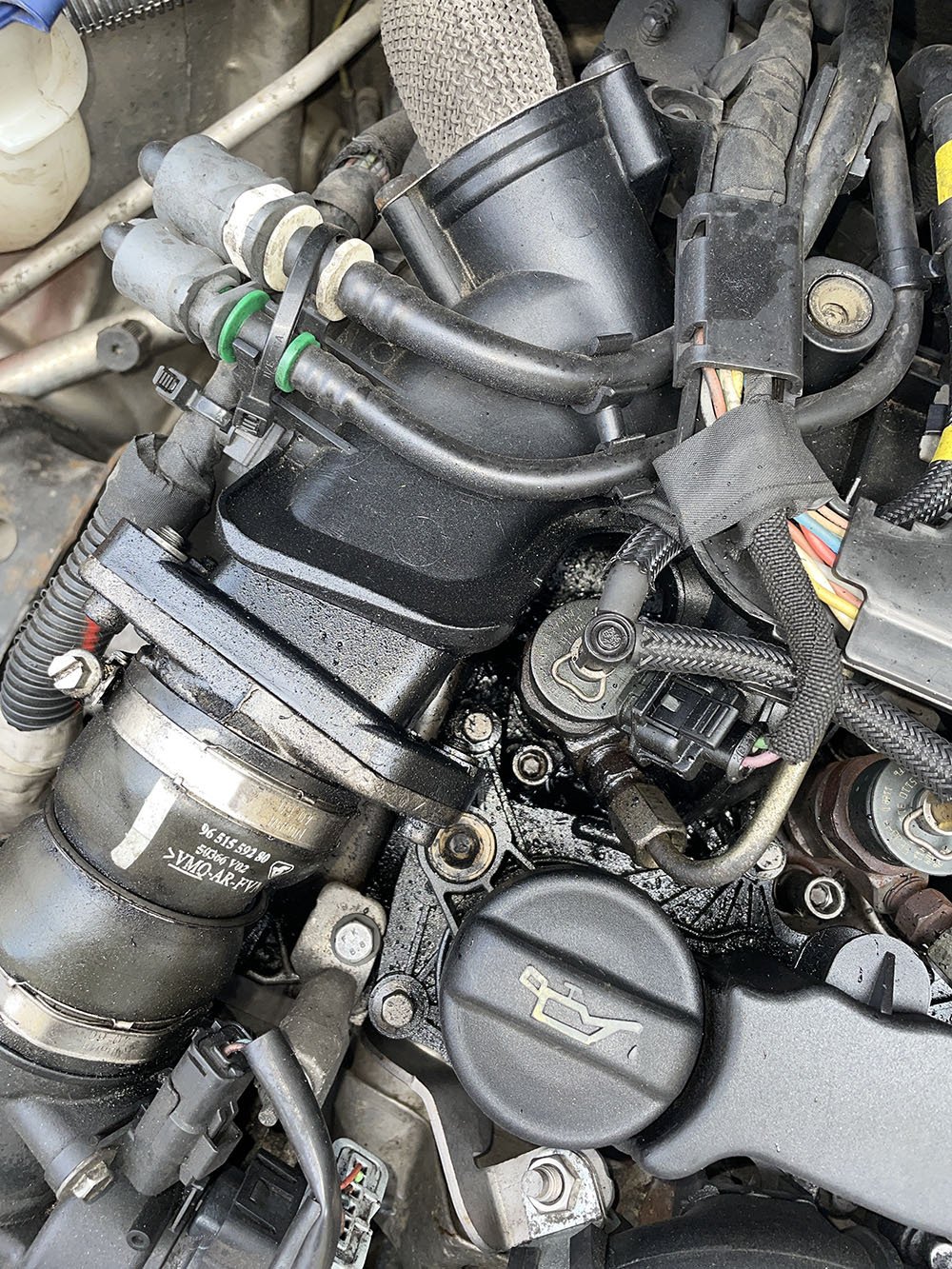 j ai mis un bout de carton entre les 2 et pour moi c'est une fuite du collecteur d' admission. comment je le sais? ben en fait a la base cette fuite ce qui m a étonné c'est le raccord de gasoil qui était plein d' huile, j ai tj eu de l huile a cause des colonettes mais ça vaporise pas comme ça.